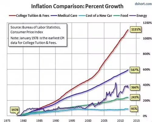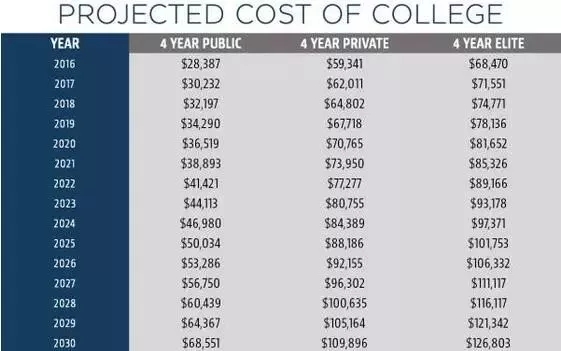 但稍微算一下,其实也不夸张。现在美国比较贵的私立大学,像纽约大学,西北大学等等,学费加上各种费用,一年也有7万美元左右了。如果按每年5%的速度增长,8年以后每年学费杂费就要到10万美元,都不可避免地要迎接这一天。