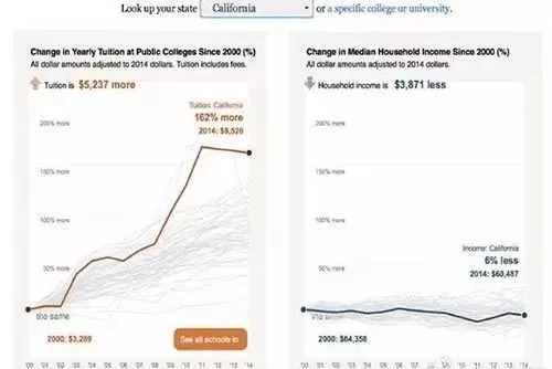 美国大学学费高居榜首,成为了中产阶层的人们最难忍受之重。2000-2014年美国公立大学学费飞涨,平均增幅达80%,而家庭收入的中位数却下滑了7%。更加严重的是加州,学费涨幅162%,而收入中位数下滑6%。